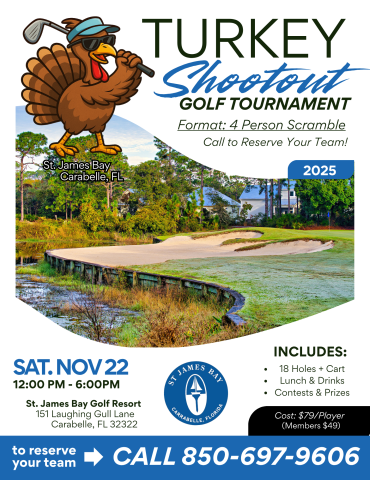Join us at St. James Bay Golf Resort for our annual Turkey Shootout Golf Tournament. It'll be a fun-filled day of golf, food, and friendly competition! $69 for the public, $39 for members!