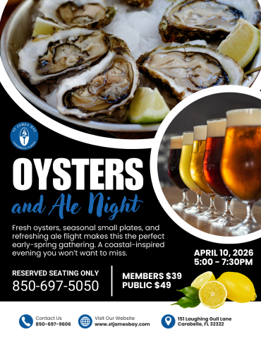 Fresh oysters, cold ales, and a casual social setting by the Bay. Celebrate the season with relaxed coastal flavors and great company. Cost: $39 Members • $49 Public Advanced seating only: 850-697-9606