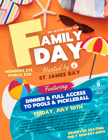 A family-centered evening with relaxed dining, kid-friendly options, and summertime atmosphere. Perfect for creating memories with loved ones. Come early to relax by the pool, or play some pickleball!