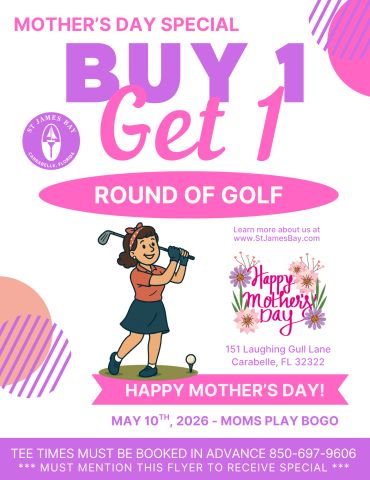 Advance tee time required. Call 850-697-9606 and mention this Mother’s Day special.