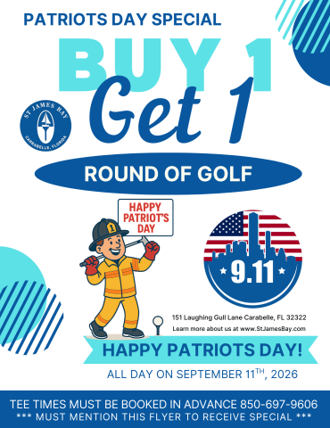 Honor Patriots Day at St. James Bay with a special Buy One, Get One round of golf. Bring a friend and enjoy a meaningful day on the course as we commemorate the heroes of 9/11. Tee times fill quickly—book early and mention this flyer to redeem.