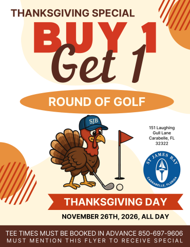 Start your Thanksgiving with fresh air, fall weather, and a BOGO round of golf at St. James Bay. Bring a family member or friend and make it a new holiday ritual. Tee times required—don’t forget to mention this flyer.