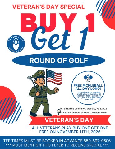 We honor all who have served. Veterans play Buy One Get One Free golf all day long at St. James Bay. Enjoy a relaxing day on the course and take advantage of complimentary pickleball as well. Please call ahead to reserve your tee time and bring this flyer.