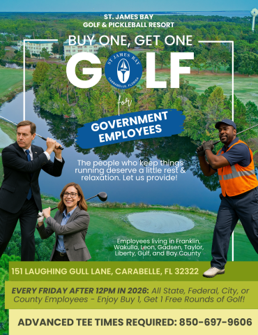 Give yourself a well-earned break on the course. Every Friday after 12PM in 2026, all State, Federal, City, and County Government Employees receive Buy One, Get One Free rounds of golf at St. James Bay.