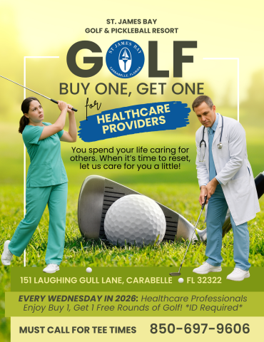 You spend your life caring for others—let us care for you a little. Every Wednesday in 2026, Healthcare Professionals enjoy Buy One, Get One Free golf rounds at St. James Bay.